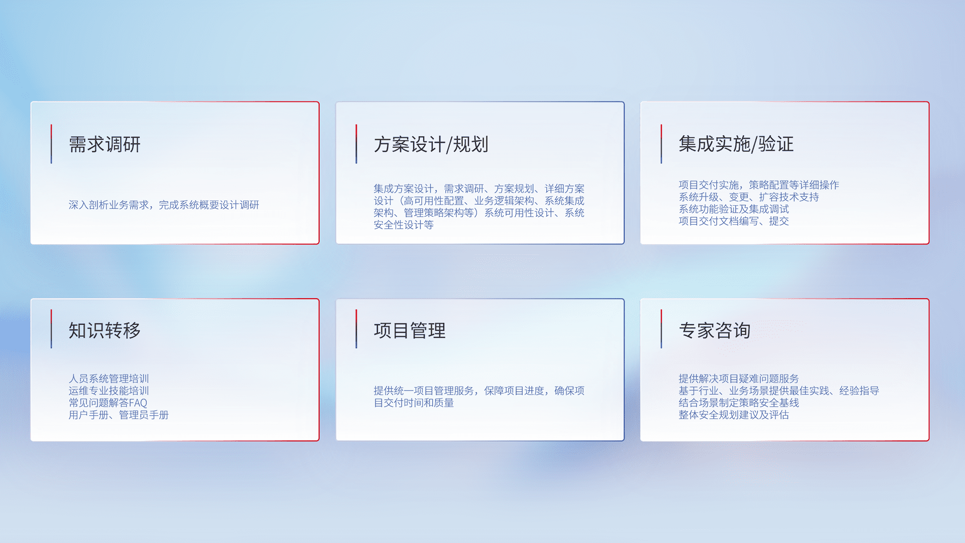 针对客户行业特性,,,,将宏观的安全战略和需求,,通过专业的交付服务,,,,实现项目落地,,,为客户提供标准规范的集成交付服务。。。。